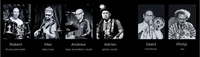 Robert Kluivers (drums), Mac De Roode (bas en tuba), Andrew Waterman (keys, accordeon, zang) en Adrian Goormachtigh (gitaar, zang), aangevuld met Geert Van Gorp(trombone) en Philip De Goey (sax)